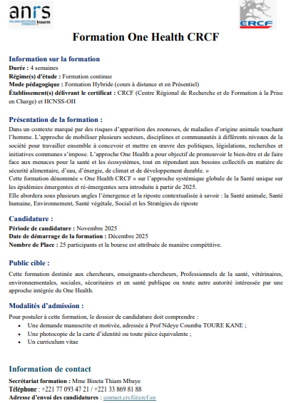 Le Centre Régional de Recherche et de Formation à la Prise en Charge (CRCF), en partenariat avec le HCNSS-OH, a le plaisir d’annoncer l’ouverture des candidatures pour la formation certifiante One Health CRCF, prévue pour décembre 2025.